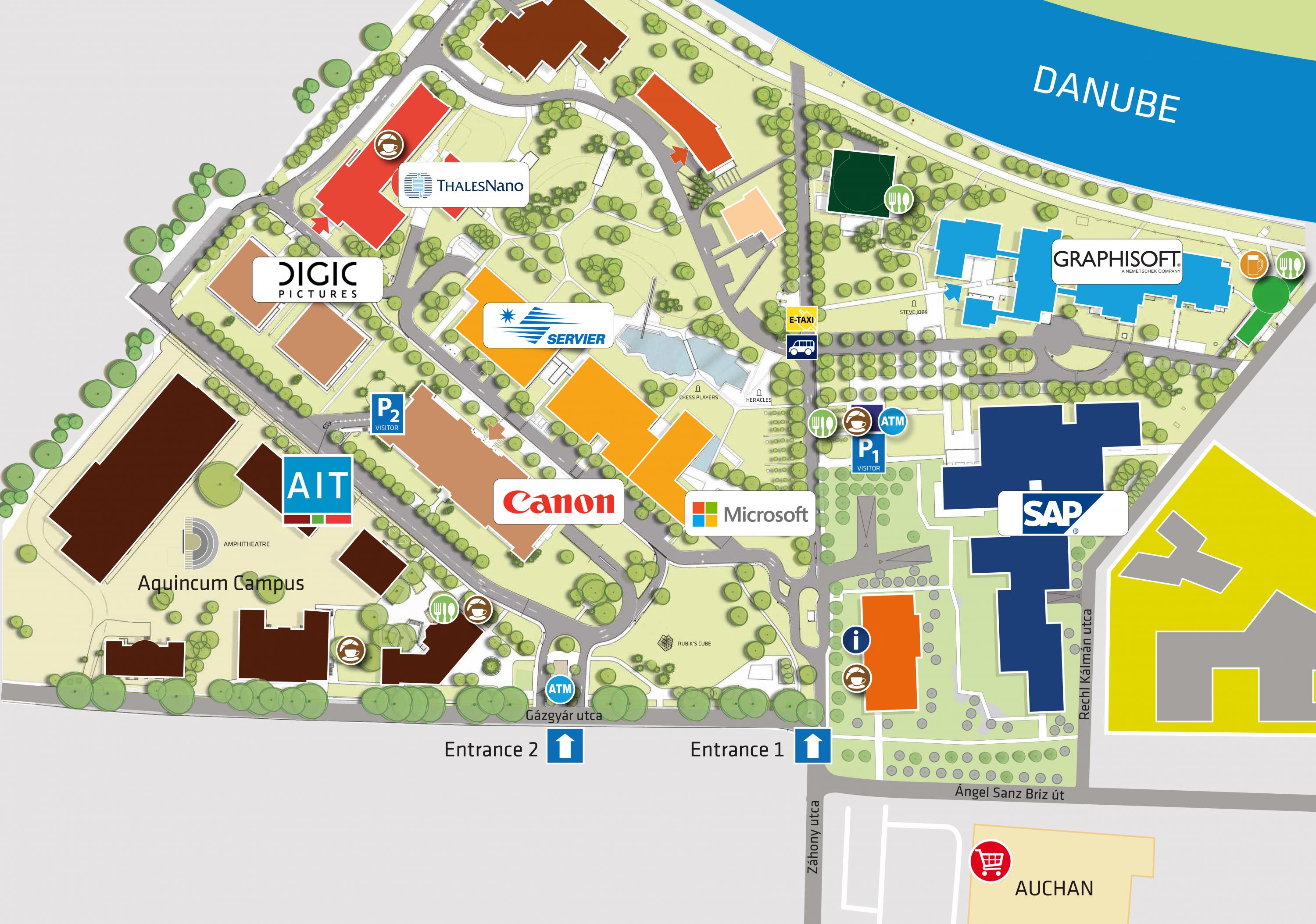 AIT Campus is embedded in Graphisoft Park a state-of-the-art science park. The park hosts 100+ R&D and pharmaceutical companies (such as Microsoft, SAP, Canon, Servier) with 5000+ employees and international education institutions with 1000+ students.